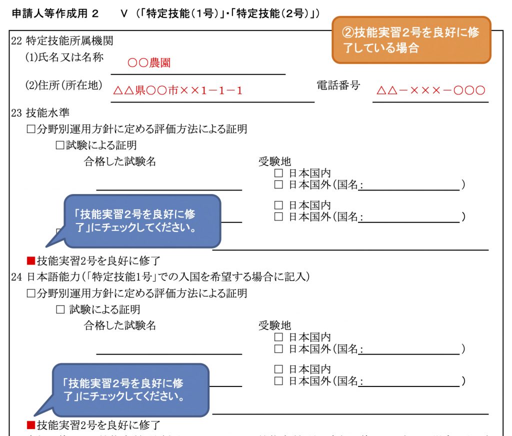技能実習2号を良好に修了している場合は以下の内容を記入します。