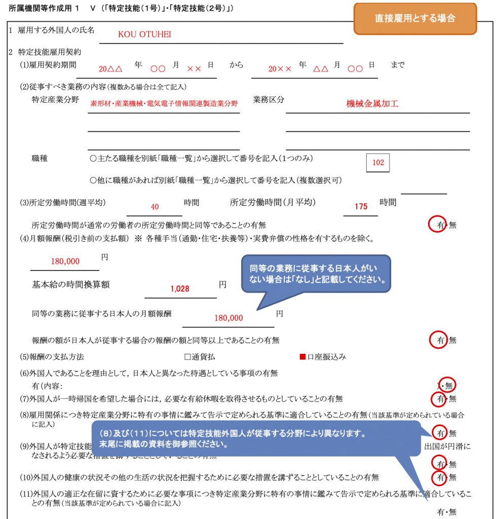 続いて、特定技能所属機関(特定技能外国人を受入れる企業)に関する情報、特定技能所属機関や支援責任者などが法令違反をしていないかといった、適正性を確認する項目をチェックします。派遣雇用の場合は派遣先が適正かどうかを記入しますが、直接雇用の場合、記入は省略できます。