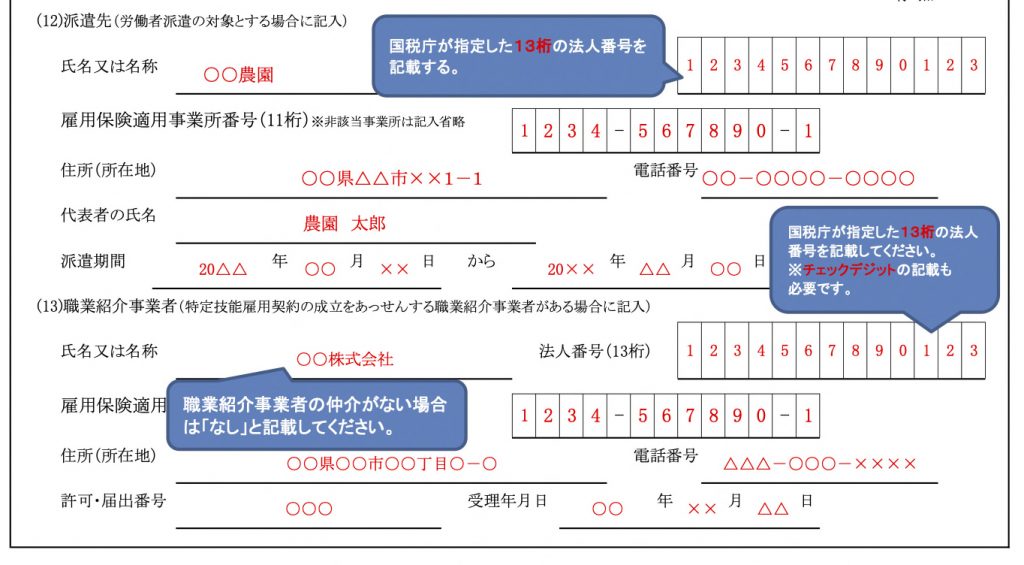 次に、派遣先に関する情報を記入します。直接雇用の場合は派遣先の名称の欄に「なし」と記入して、次の項目に進めば問題ありません。(※2024年11月現時点では農業と漁業分野のみ派遣雇用が可能)取次機関や職業紹介事業所の仲介が無い場合も「なし」と記入してください。(遣先と職業事業所に関する情報の項目にある法人番号は、国税庁が指定した13桁の法人番号)