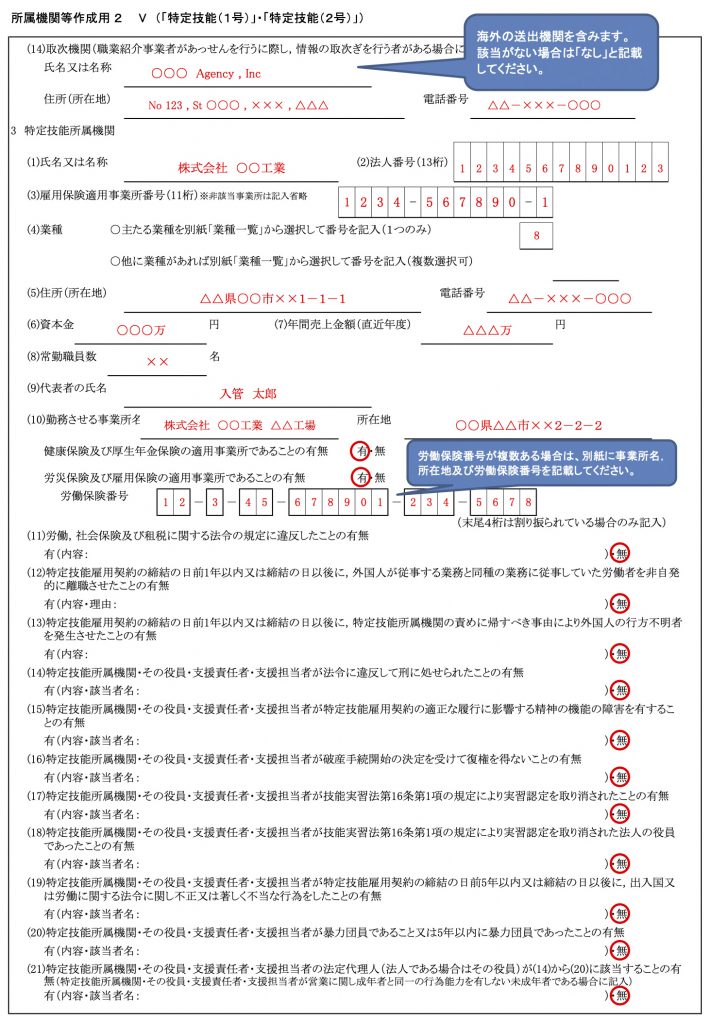 - 22:特定技能所属機関(受け入れ企業)の名称、住所、電話番号