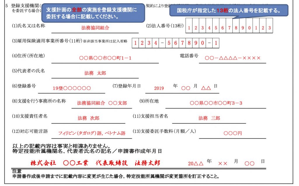 支援計画の項目をチェックしたのち、企業名と代表者氏名、在留期間更新許可申請書の作成日を記入します。