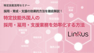 セミナー・説明会 [Linkus]特定技能活用セミナー:特定技能外国人の採用、雇用、支援業務を効率化する方法 外国人雇用をテクノロジーで支援するBEENOS HR Link株式会社(以下「BEENOS HR Link」)は、特定技能外国人雇用に関するウェビナーを3月3日(木)に開催。この記事では、[Linkus]代表取締役・岡﨑氏による「特定技能外... 2022.04.25 セミナー・説明会
