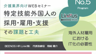 セミナー・説明会 【介護業種向けウェビナー】3社合同で開催!特定技能外国人の採用・雇用・支援、その課題と工夫 外国人雇用をテクノロジーで支援する[Linkus]を運営する、BEENOS HR Link株式会社は、特定技能外国人雇用に関するウェビナーを3月18日(金)に開催。【特定技能外国人の採用・雇用・支援、その課題と工夫】というテーマについて、公... 2022.05.27 セミナー・説明会