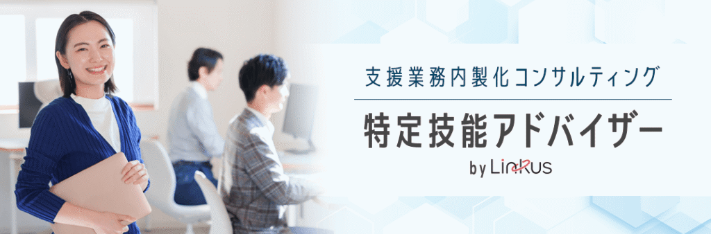 [Linkus]を提供するBEENOS HR Link株式会社では、受け入れ企業の支援業務内製化を支援する、[特定技能アドバイザー]を提供しております。まずは、書類作成と申請業務のみからでも、内製化にご興味があればお気軽にご相談ください。