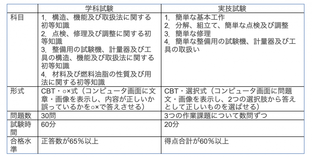 特定技能のために作られた技能試験「自動車整備分野特定技能評価試験」か、日本の国家試験「自動車整備士技能検定試験3級」に合格する必要があります。「自動車整備分野特定技能評価試験」の技能水準は「自動車整備士技能検定試験3級」と同程度で、試験の科目・形式などは以下の通りです。