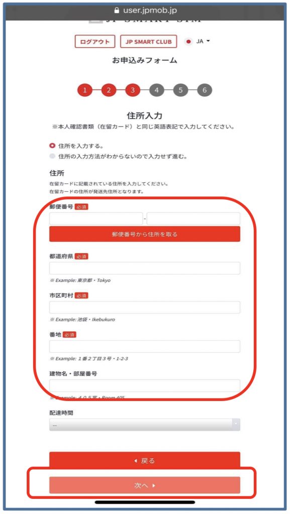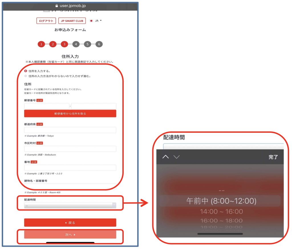 住所を入力後、SIMカード受け取りの配達時間を選択し、<次へ>をクリックします。