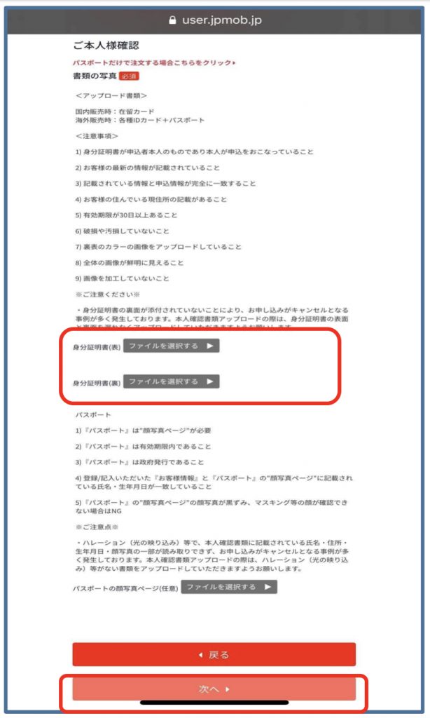本人確認書類の写真をアップロードします。アップロード後、<次へ>をクリックします。