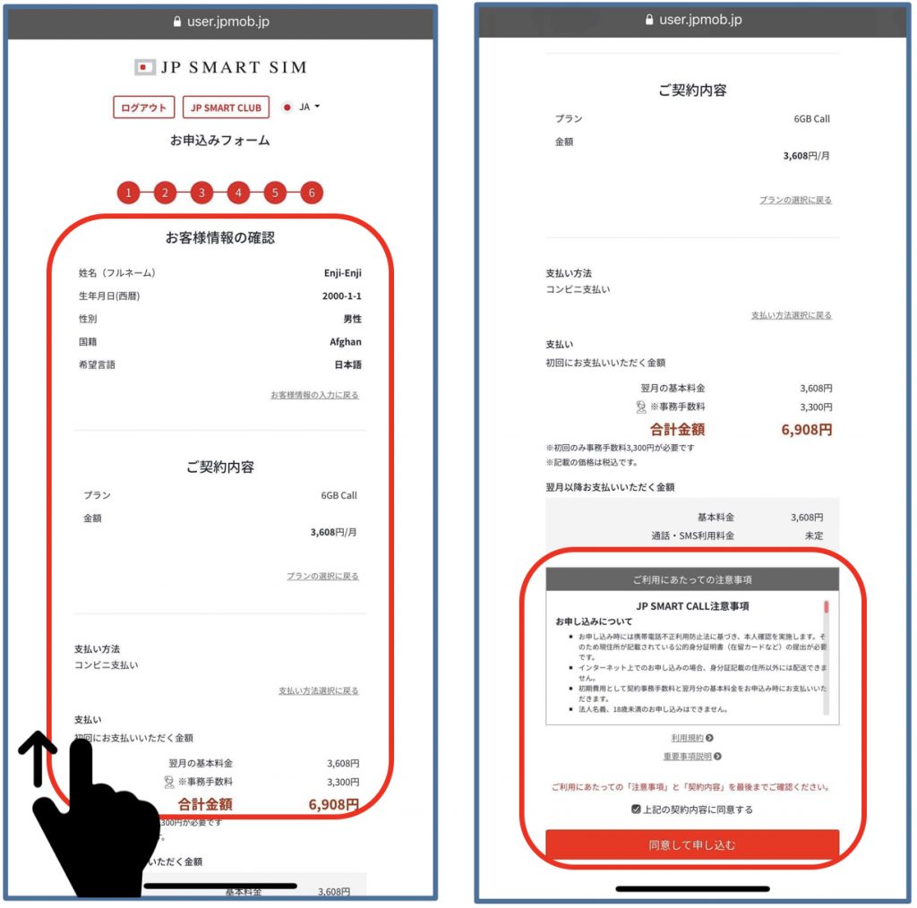 ・JP SMART SIM「ご利用にあたっての注意事項」を確認してから、同意の☑︎をチェックし、<同意して申し込む>をクリックします。