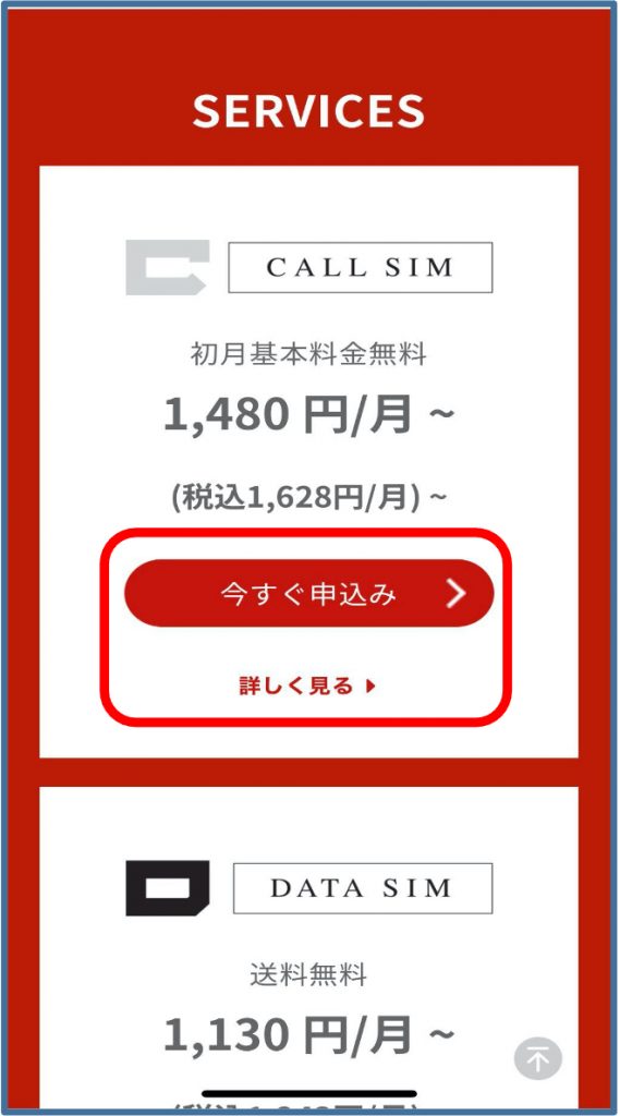 ホーム画面に戻り、うえへスライドし、申し込みたいサービス(CALL SIM、DATA SIM)とデータ容量の<今すぐ申込み>をクリックします。
