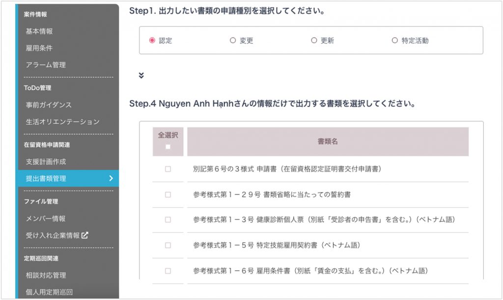 認定申請書類生成 変更申請書類生成 更新申請書類生成 各種参考様式生成 定期届出書作成 随時届出書作成 帳簿・管理簿作成 出力前プレビュー まとめて出力 多言語書類切り替え 特定活動申請書類生成