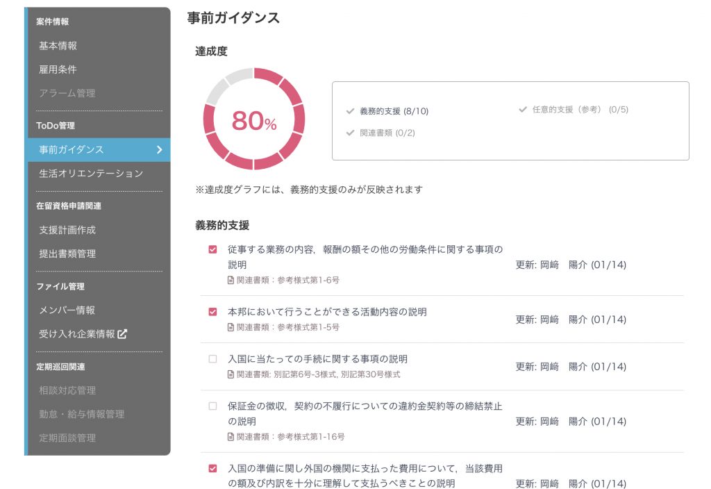 「やること」機能 在留資格更新アラート 定期面談アラート 健康診断アラート 勤務実績管理 給与実績管理 36協定更新アラート 協議会加盟証明書更新アラート 複数案件担当者設定 関連帳簿書類への自動反映