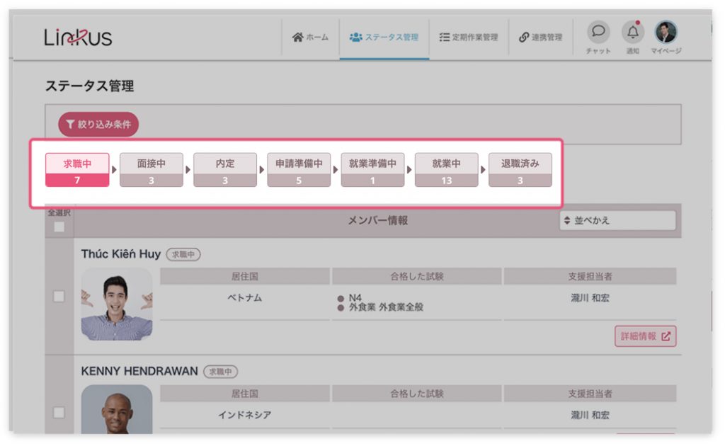 外国人材メンバーが面接中なのか、在留資格申請中なのかなど、ステータスの管理や共有が可能。