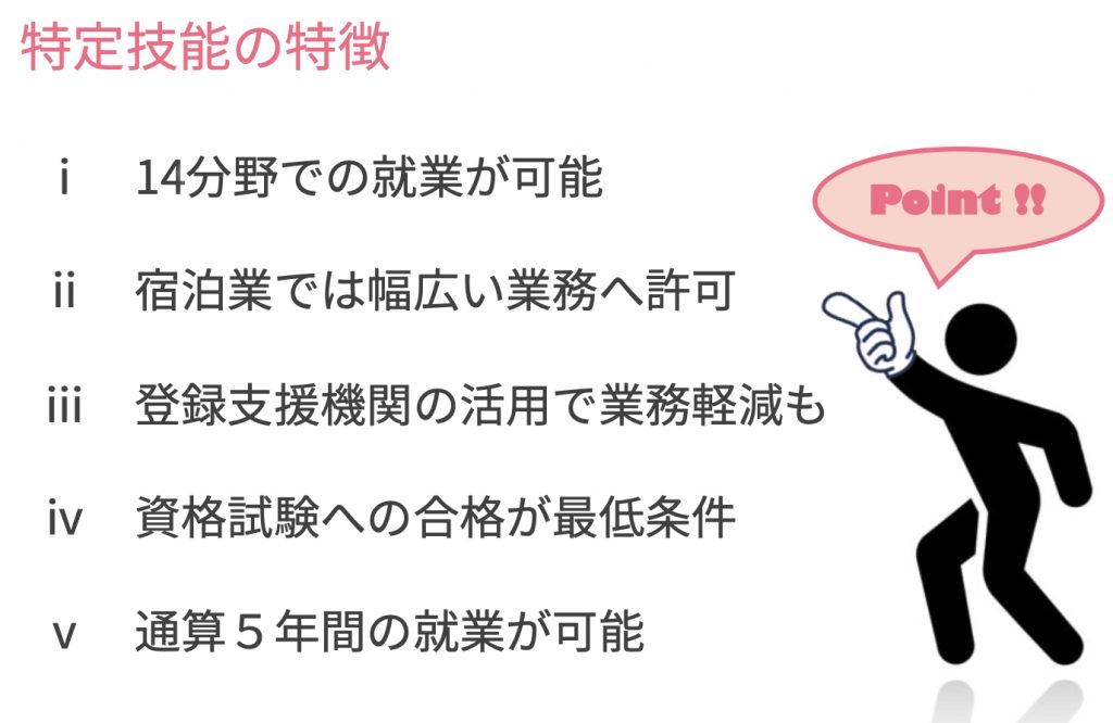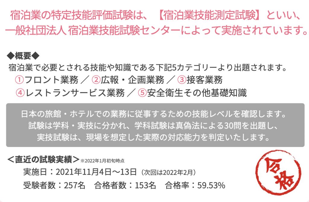 ちなみに、【特定技能】には1号と2号があり、現状【宿泊】は1号のみです。【特定技能】1号は、通算で最長5年間日本で働くことができますが、今後制度の見直しが行われ、さらに長く働けるようになるのではないかと言われています。