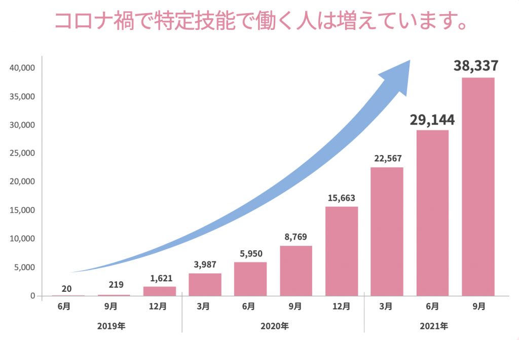 2021年6〜9月は伸び率が上がっています。パンデミックの影響で新規入国者は激減したものの、他のビザで日本に滞在していた方が母国に帰国もできないという状況も平行して起こっております。帰国できない方の次の動きとして、【特定技能】に在留資格を変更するケースも増えています。グラフにもある通り、現在は4万人ほどの特定技能外国人の方が日本で働いているということになります。