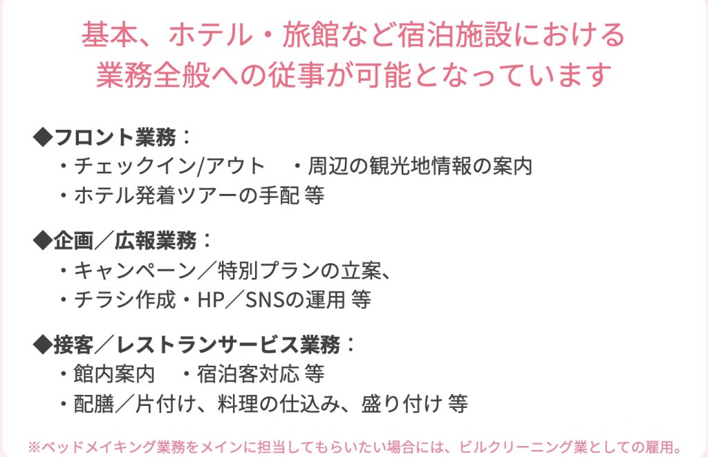 加えて、ホテル内のレストランや厨房での業務も含まれております。レストラン内にあるホテル直営のレストランであればその業種は“宿泊”の一部とされますし、テナントとして入っているレストランの業種は【外食】とされます。ただし、ベッドメイキング業をメインで任せる場合は、【特定技能・ビルクリーニング】として雇用した方がよいでしょう。