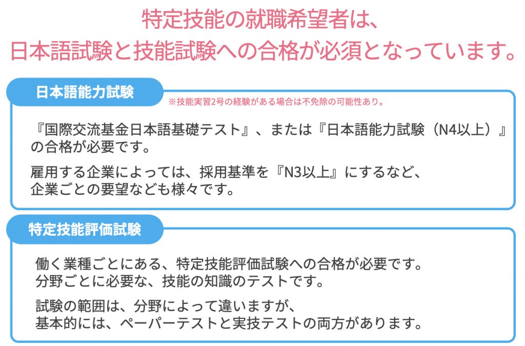 日本語能力で基準となるのはN1〜N5で示されるランクです。特定技能はN4以上の合格が求められますが、実際に雇用する企業によっては、N3以上を希望される場合もございます。特定技能評価試験は実技と知識のテストで、業種によってそれぞれの業界団体が実施するものです。