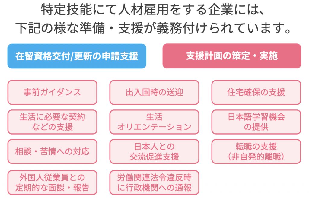【特定技能】で海外人材を雇用する企業には、様々な準備・支援が義務付けられています。
