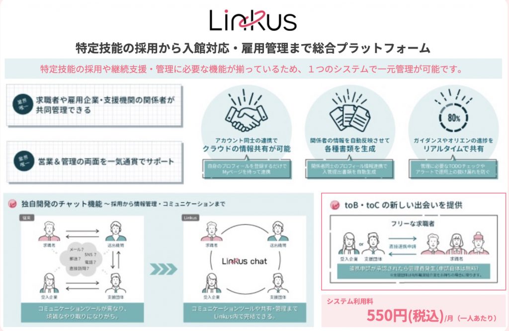 弊社の[Linkus]では、必要な情報を保管したり、PCでの簡単操作で書類を作成したり、求職者を探したりといった、【特定技能】の採用から雇用・支援を一元化できるサービスです。システム利用料は海外人材の情報を管理するのに、一人あたり550円/月で、全ての機能をお使いいただけます。