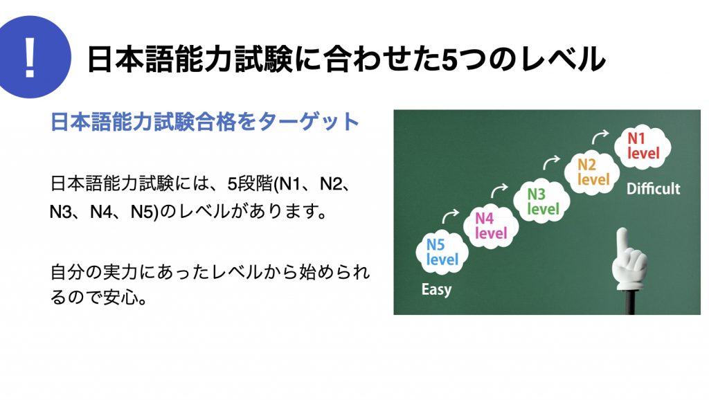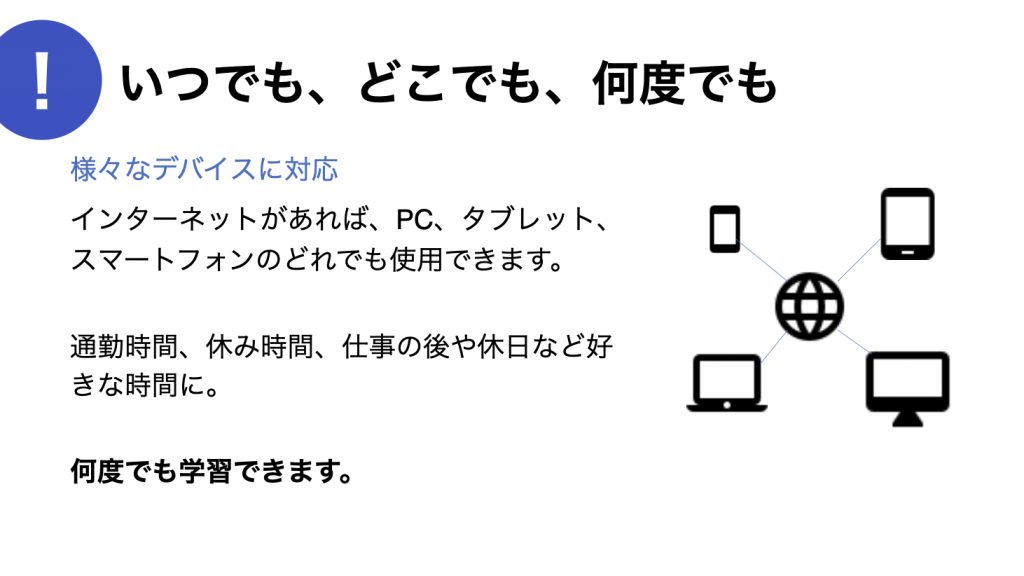 言語学習において重要となるポイントは繰り返し(反復)です。e-ラーニングの素晴らしい点は、PC、スマホ、タブレットを使って、いつでもどこでも何度でも学習ができることです。ライブ授業と違って無駄な世間話・脱線等もなく、しっかりと作り込まれています。語学教育の重要な要素は“繰り返すこと”ですから、無駄のない授業で効率よく理解を深め、反復によって日本語をしっかりと身につけていただけることでしょう。