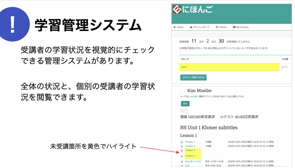 また、このプログラムには【学習管理システム】が備わっています。e-ラーニング自体のメソッドは優れているものの、使わなければ意味がありません。そこで【学習管理システム】によって本人の学習意欲向上を促すとともに、導入した企業等で学習進捗を管理する人の進捗管理を行うために管理システムが用意されています。