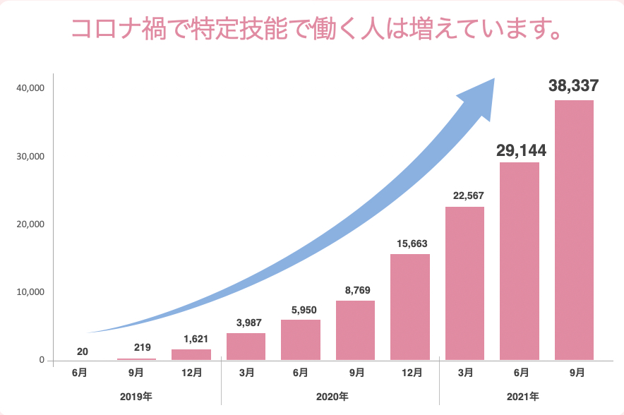 コロナ禍でも人数が増えていることから、日本国内での特定技能に対する注目度は高まっていると言えるでしょう。2022年3月から外国籍の方の新規入国が緩和されることで、特定技能外国人数もより増えてくると考えております。