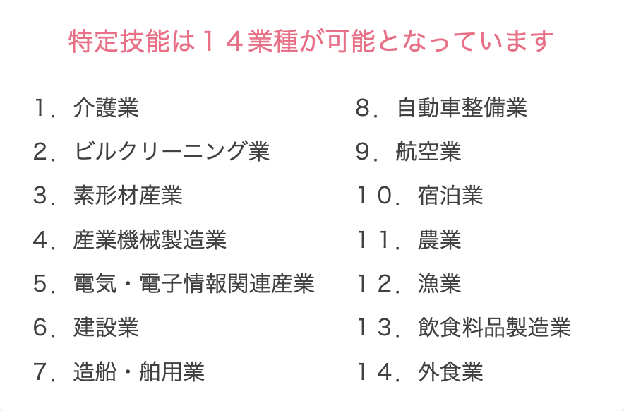 その特定技能の特徴について、大きく分けて5つあります。【特定技能】は14分野での就業が可能であり、特定技能に隣接する在留資格【技能実習】よりも仕事内容の幅が広がっています。