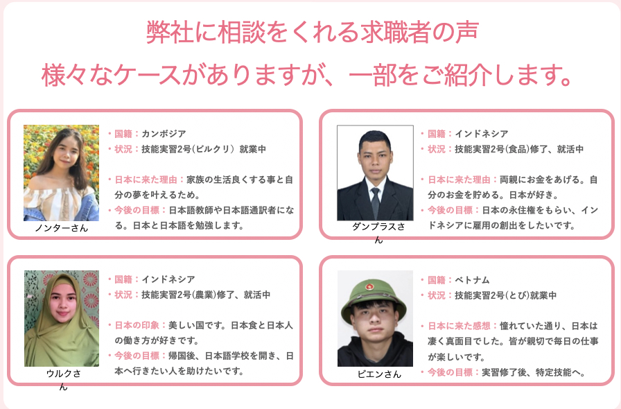ここで、弊社[Linkus]のプラットフォーム上でどんな方がお仕事を探しているのか、といった事例をご紹介させていただきます。外国籍の方の来日の目的は下記の通り「現地よりも日本で働いた方が給料が高い」「家族の生活を良くするため」「稼ぎたい」というのがよく聞かれます。ただし、それだけではなく「日本語講師や日本語通訳といった、将来的な目標や夢のために、現在技能実習生として日本で働いている」という方もいらっしゃいます。