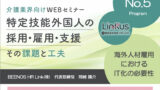 今回のウェビナーでは、公益社団法人国際厚生事業団 JICWELS(ジックウェルズ)、株式会社ツクイ、BEENOS HR Link株式会社、3社それぞれの代表者に、【特定技能外国人の採用・雇用・支援、その課題と工夫】というテーマについて解説していただきました。