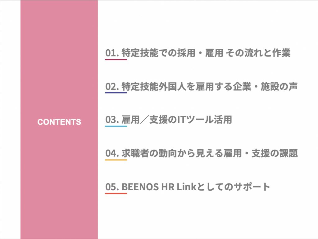 外国人雇用をテクノロジーで支援する[Linkus]を運営する、BEENOS HR Link株式会社は、特定技能外国人雇用に関するウェビナーを3月18日(金)に開催。【特定技能外国人の採用・雇用・支援、その課題と工夫】というテーマについて、公益社団法人国際厚生事業団 JICWELS(ジックウェルズ)、株式会社ツクイ、BEENOS HR Link株式会社、3社それぞれの代表者が登壇。