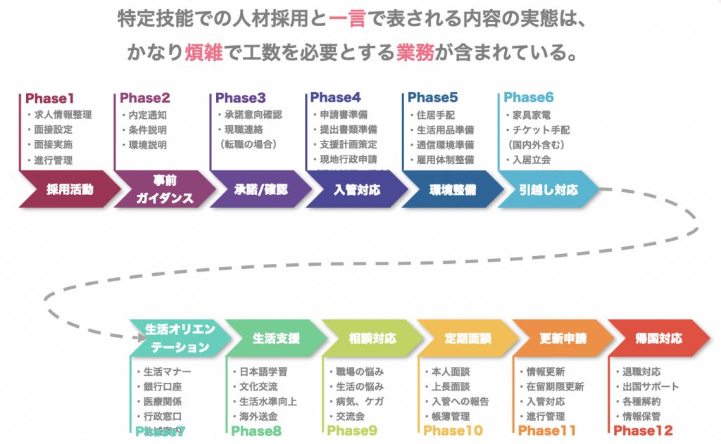 採用活動から始まり、採用・内定通知、その後のガイダンス、本人とのやりとり、入国管理局とのやりとり、各種申請など様々な作業が発生します。また、義務的支援の中に「住居の手配」というものがありますが、住居を手配しただけで外国籍の方がすぐに住めるわけではなく、家具家電の手配、引越しや移動、ガスや電気の手配なども必要です。加えて、登録支援機関や送り出し機関とのやりとりなど、各関係者との連携・連絡も作業に含まれます。表面的に見えている“作業”と、見えにくいけれど細かく時間や手間のかかる“作業”があるのです。私たち[Linkus]は、こういったものをITを活用してサポートしていく仕組みづくりを構築しています。