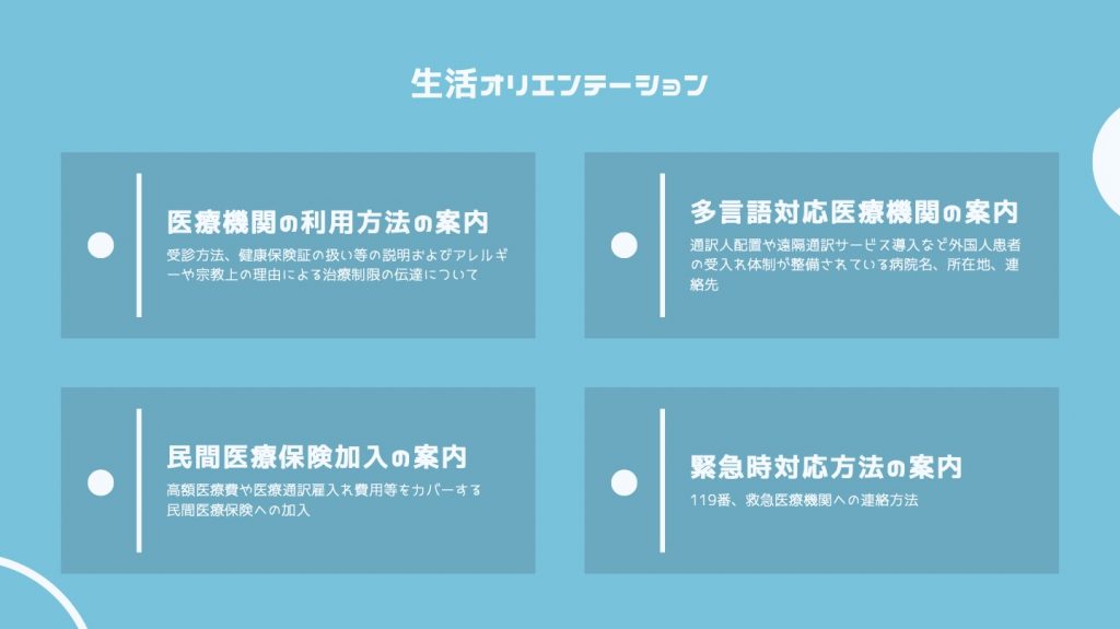 まず、生活オリエンテーションの領域です。生活オリエンテーションは、海外人材が日本で生活するために必要な知識を、海外人材がわかる言語で説明するものになりますが、以下図の4つが医療・健康に関する事項です。
