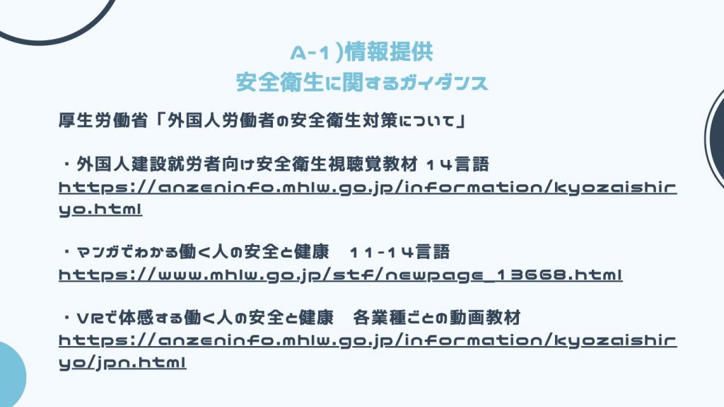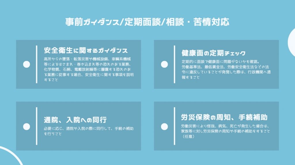 支援の第一歩は情報提供です。安全衛生に関するガイダンスについてまとめさせていただきました。特定技能外国人の出身国は全て対応しているので、ご活用いただけるかと思います。支援を外部に委託しているのであれば、その団体に通訳を徹底してしてもらうことも重要です。