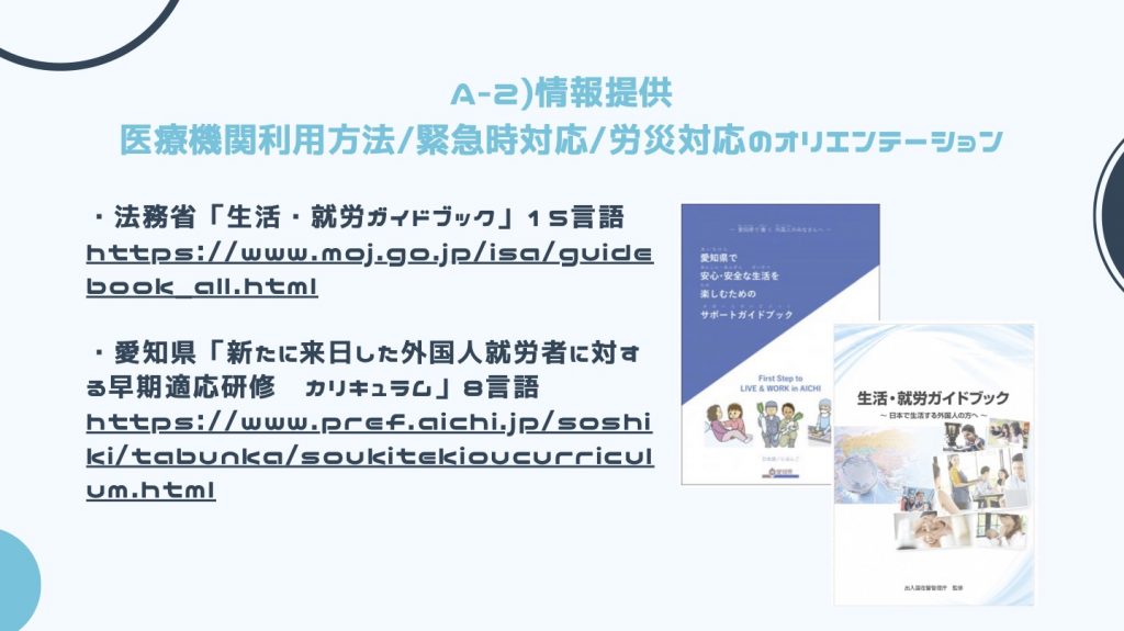 また、医療機関利用方法、緊急時対応、労災対応のオリエンテーションに関する資料で、私がおすすめのものがこちらです。支援する側のマニュアルも含まれているので、受け入れ企業や登録支援機関の担当者さんにも使いやすいと思います。