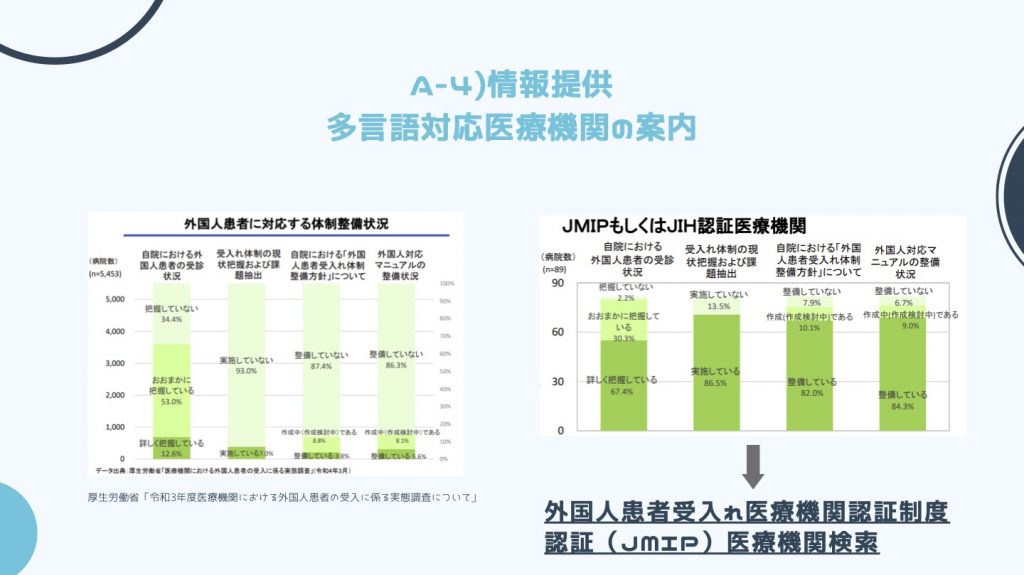 「その医療機関が多言語対応しているか」を調べるのは大変ですし、そもそも多言語対応している医療機関が少ないのが現状です。一方で外国人患者受入れ医療機関認証制度 認証(JMIP)医療機関検索といったサービスもあるので、ぜひご活用ください。