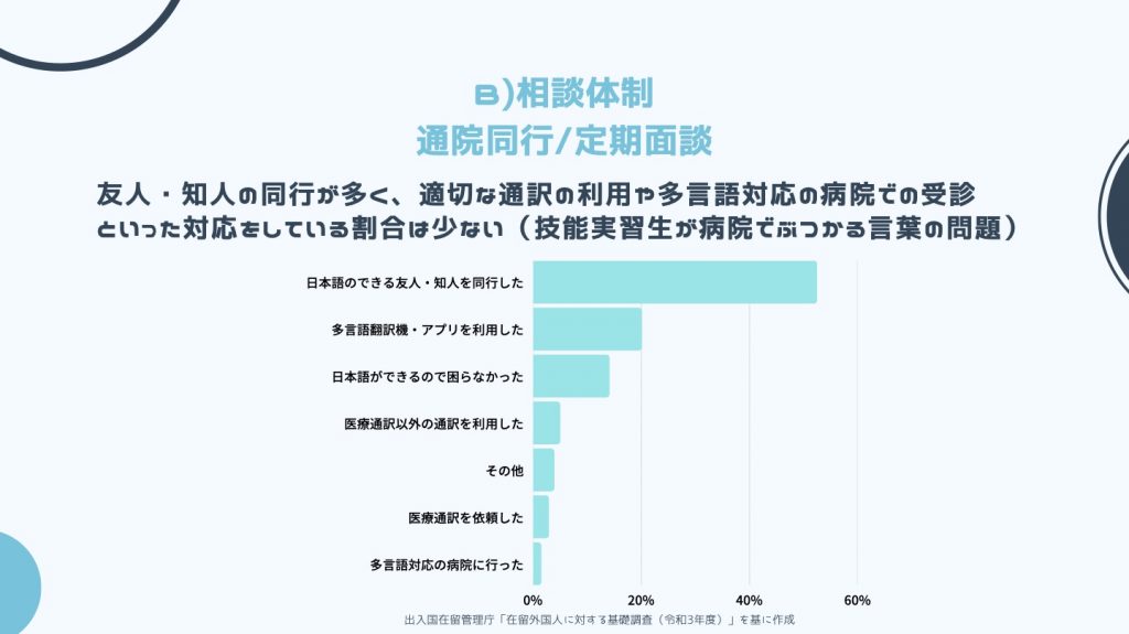 医療機関を受診した際の言葉の壁について、どう対応しているかというアンケートです。適切な通訳を利用したり、多言語対応している病院を受診する方が少ない結果となっています。監理団体がサポートをしているはずの技能実習であっても、適切な情報提供や病院への同行といった支援が不十分であることが見て取れます。先程お話したように、特定技能において、これらの支援は義務とされているので、受け入れ企業や登録支援機関は多言語対応している医療機関を事前に調べておく、病院に通訳を同行させるといったといった対応は必須です。