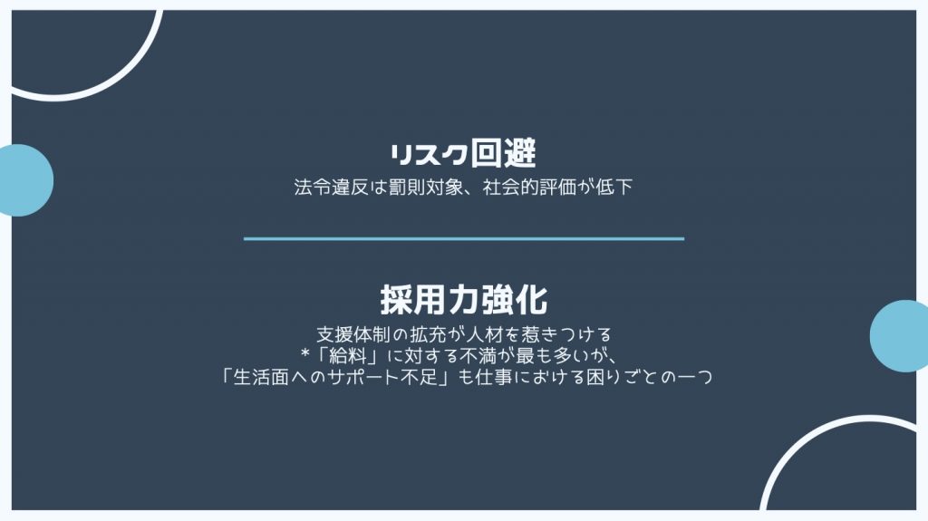 支援は義務ですので、行わなければ法令違反として罰則対象となります。また、人材の獲得と定着率を解消するためにも、採用力の強化は避けられません。支援体制の拡充が人材を惹きつけるポイントとなります。「法律で決められているから」というところから一歩踏み込んで「働きやすい環境整備」という観点から支援を行っていく必要があるでしょう。