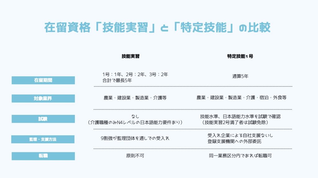 特定技能は1号と2号があり、2号は支援の義務はありませんので、今回は特定技能1号に関する内容となっています。特定技能とよく比較される技能実習について、簡単に比較した表はこちらです。
