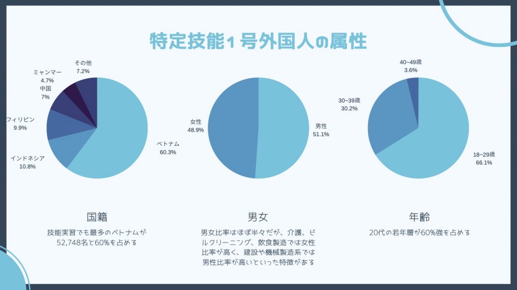 特定技能外国人の属性ですが、国籍はベトナムが最も多く、次いでインドネシア、フィリピンの順です。男女の比率はほぼ変わりませんが、介護、ビルクリーニング、飲食製造は女性の比率が高く、建設や機械製造系は男性の比率が多いといった特徴があります。