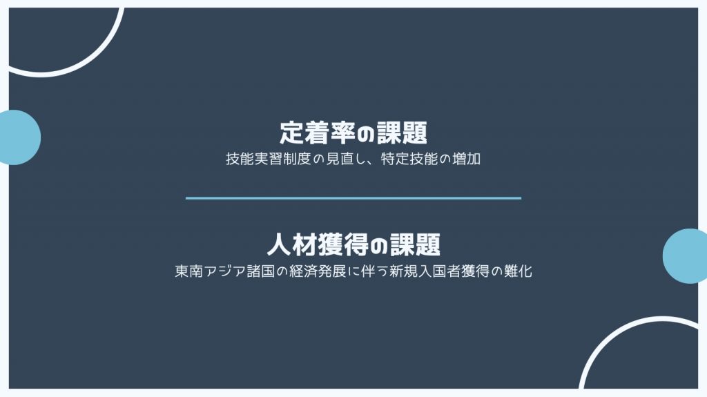 もうひとつが人材確保の課題です。東南アジア諸国の経済発展に伴って新規入国者を獲得することが難しく、日本へ働きにきてくれる人材が減ってしまうことが予想されます。現状は中国から日本へ働きに来る方が減り、ベトナム国籍の方が多くなっていますが、この状況はどんどんと変わっていくでしょう。職場にきてくれた海外人材をできるだけ定着させることが重要ですが、こういったことをクリアしていくためには支援の強化が重要です。