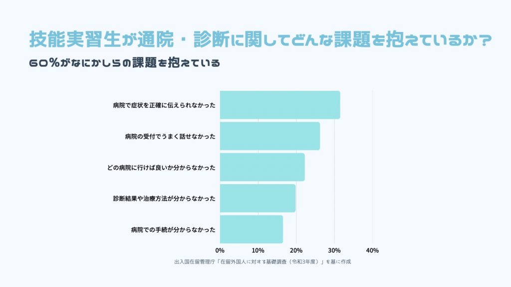 それぞれの段階で課題となっていることは明白です。医療機関へのアクセスに関しては、ヘルスリテラシーや情報の不足が挙げられるため、健康に関する知識や病院に関する情報について提供していくことが課題解決につながるでしょう。適切な治療へのアクセスに関しては言葉の壁が最も代表的な課題です。「病院で症状を正確に伝えられなかった」「病院の受付でうまく話せなかった」という声がそれに該当するかと思います。