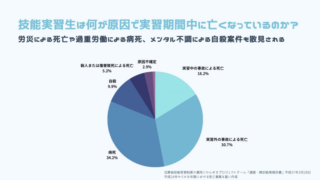平成24年からの8年間のデータによると、技能実習生が亡くなった事案は、認識されているだけで170件を超えています。その内訳は「実習中の事故による死亡」「実習外の事故による死亡」「病死」などが挙げられています。今回のテーマに関連する案件は、労災による死亡や長時間労働が原因の病死、メンタルの不調による自殺かと思われます。不調を放置すると、こういった最悪のケースが起こり得ます。こうならないためにも、通院・診断の課題をしっかり解決する必要があります。