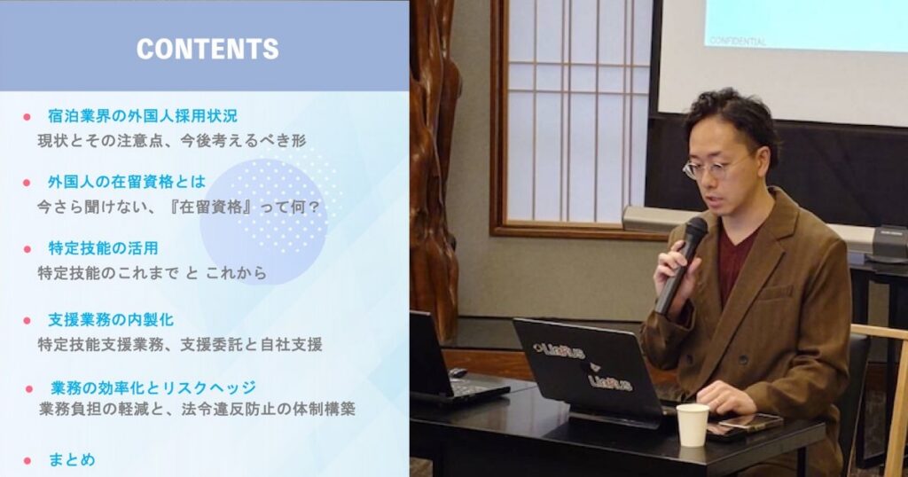 代表の岡﨑陽介は、講演「外国人材受入れ後の内製化の進め方」を担当。特定技能制度を正しく理解することの重要性と、法令違反を未然に防ぐために必要な知識について強調しました。なかでも、採用する職種と在留資格を切り離さずに検討する必要性を指摘。宿泊業界における外国人材雇用の実態をデータで示しながら、特定技能の活用が十分に進んでいない現状や、採用時に直面しやすい課題について解説しました。